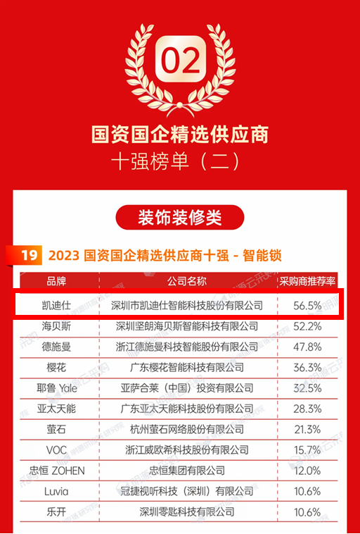 最終,凱迪仕通過規模實力、品牌榮譽、產品創新與研發、產品質量穩定性,4大維度、總計30項大數據的評分篩選,采購商推薦率高達56.5%,以行業第一的成績,斬獲智能鎖行業「國資國企精選供應商十強榜單」第1位!