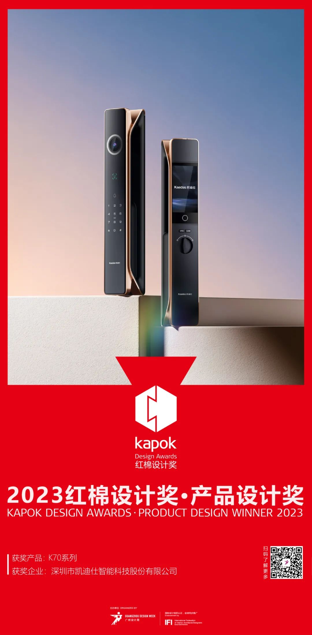 作為廣州設計周的緣起項目,紅棉設計獎于2006年在政府主導下啟動,是中國最具影響力的設計獎項之一。凱迪仕K70“千里眼”智能鎖,憑借穿梭星河之間、想象不凡體驗的高端設計理念,成功斬獲「紅棉設計獎 · 2023年度產品設計獎」,是本屆紅棉中國設計獎3C數碼領域唯一獲獎品牌,同時也是智能鎖行業唯一獲獎品牌。