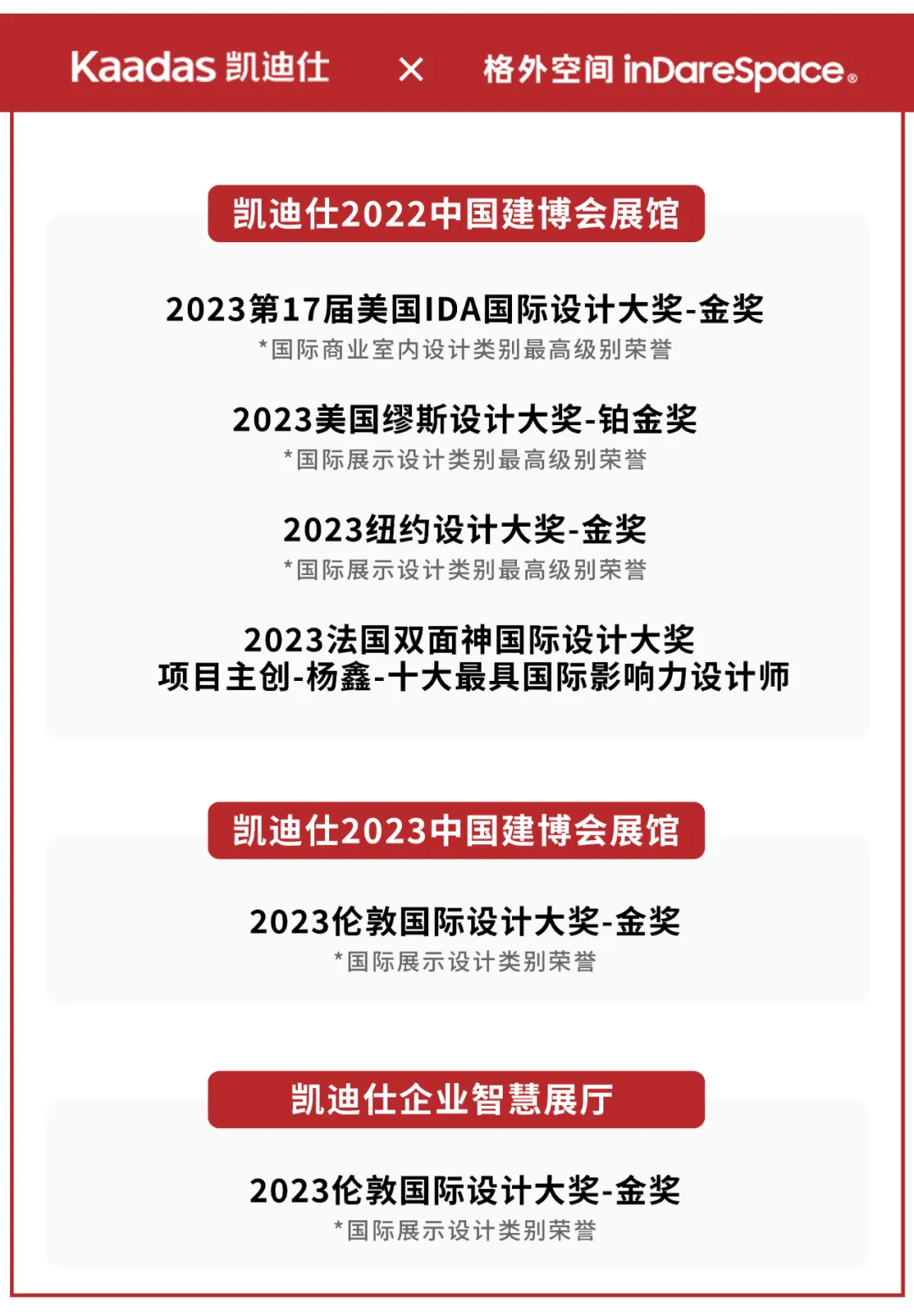 2023年,凱迪仕與格外空間合作的展廳系列項目,在國際設計大獎中攬獲6項大獎,詳情見下圖: